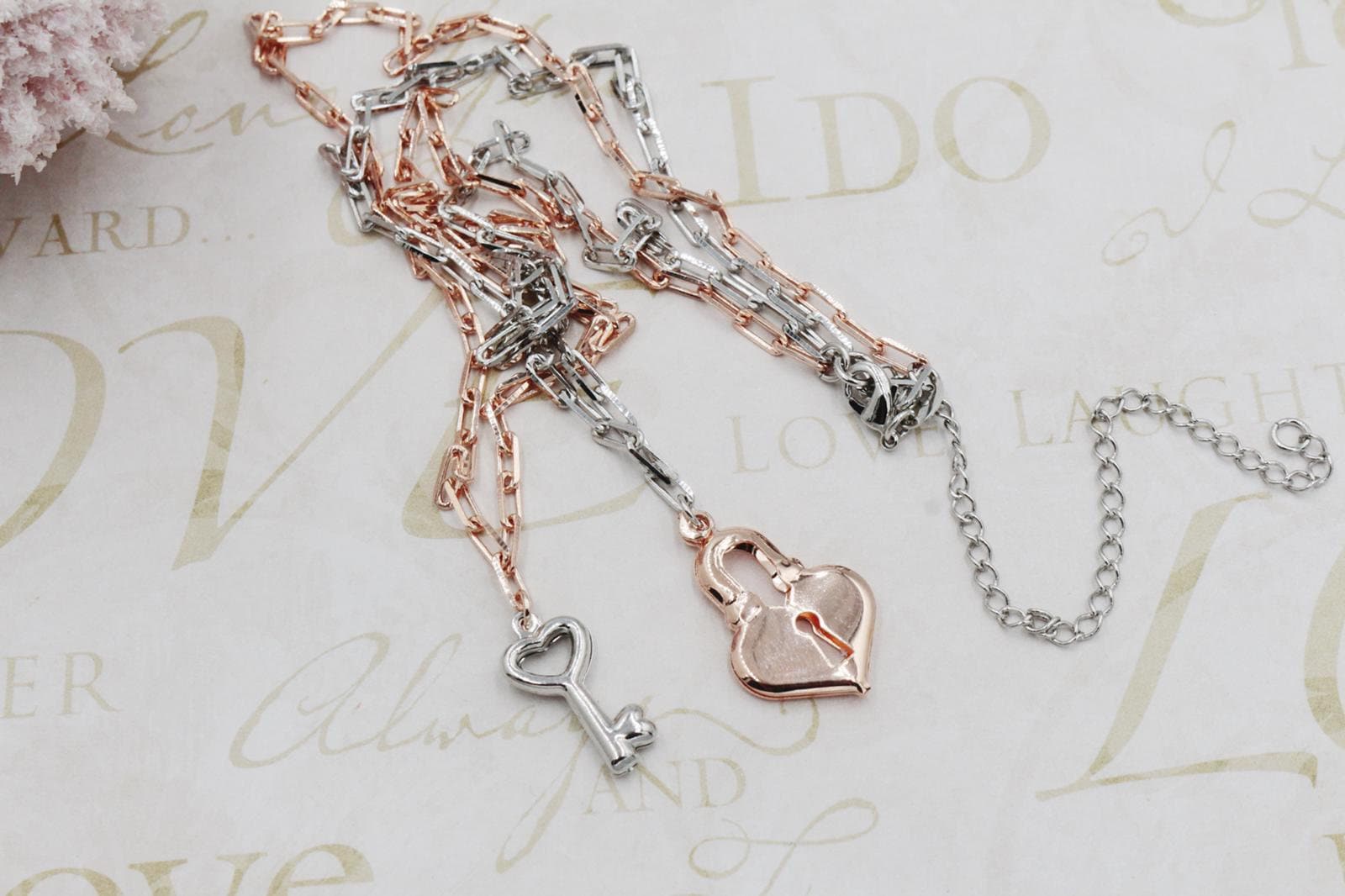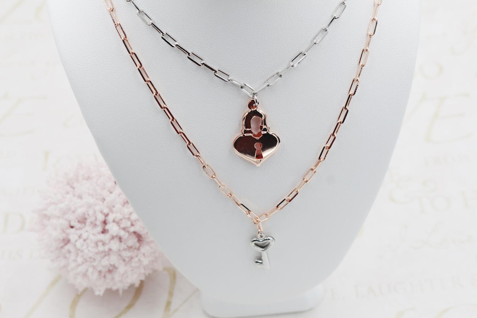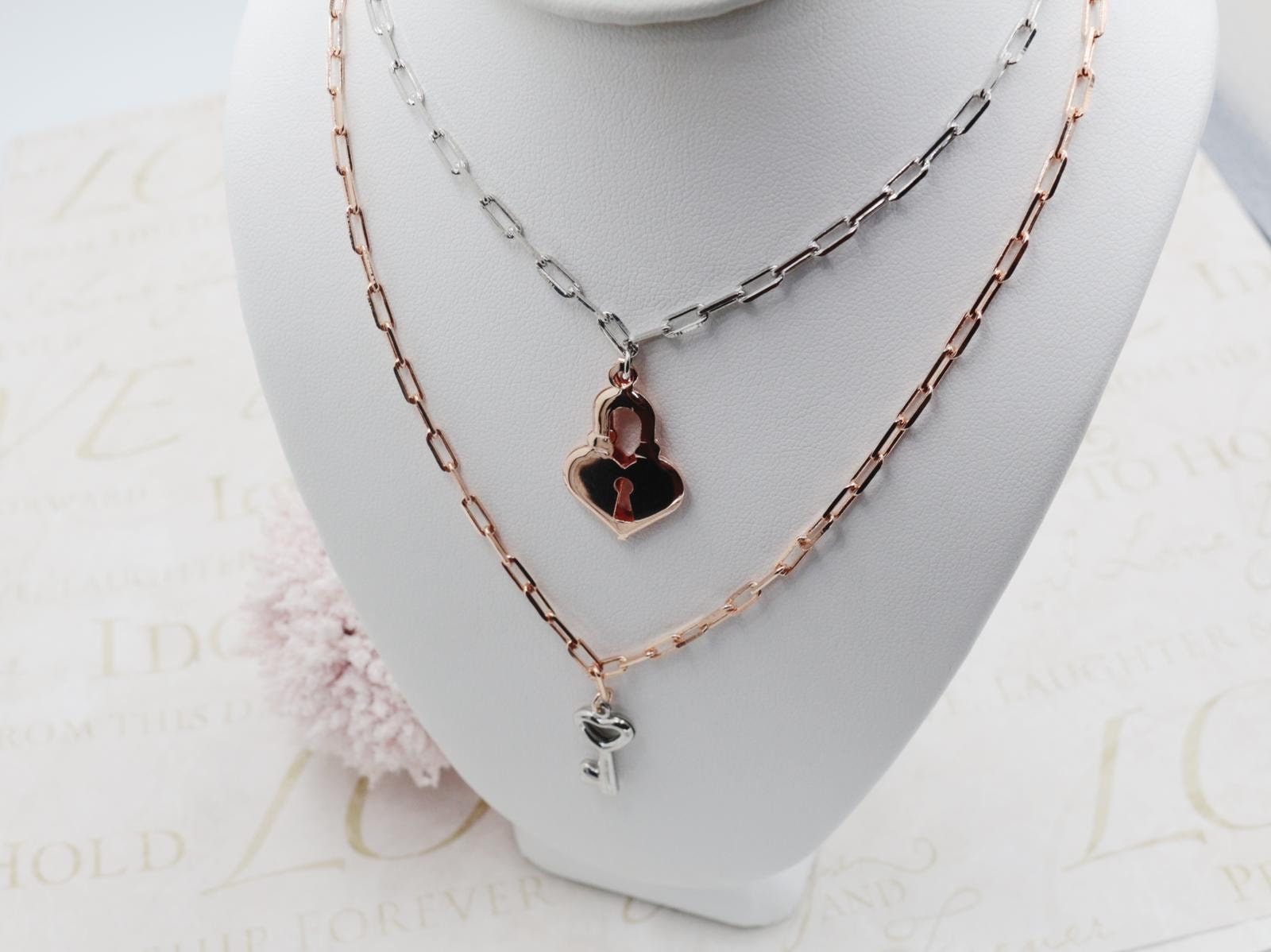 Stainless Steel and Rose (Two Tone), Silver Key and Rose Lock Necklace.